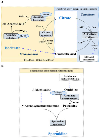 Pathway enrichment analysis of the differential metabolites of the intestinal contents in the four treatments. (A) Pathway of TCA cycle; (B) Pathway of spermidine and spermine biosynthesis.