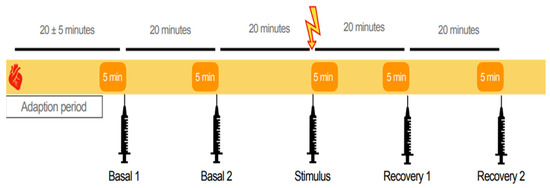 General experimental procedure: in total, five blood samples were collected from all animals (n = 24), irrespective of Co or Tr group. Basal blood samples were collected 40 min (Basal 1) and 20 min (Basal 2) prior to stimulus application. The third blood sample (Stimulus) was taken 1–3 min following stimulus application. Finally, the samples were collected 20 (Recovery 1) and 40 (Recovery 2) min after stimulus application to map the possible return of the SCC to baseline. The solid yellow bar represents the continuous recording of HRV parameters from a sub-group of Tr animals (n = 5). Analysis of HRV parameters occurred later, using 5 min time windows (orange boxes) [38], and was oriented around the time of blood sample collection.