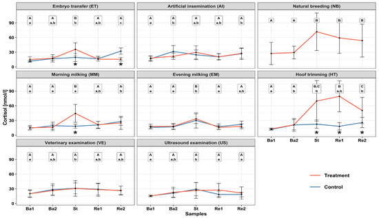 The course of serum cortisol concentrations over time, subdivided for the Co and Tr groups for each stimulus: Ba1 = −40 min before stimulus application, Ba2 = −20 min before stimulus application, St = 0 min, Re1 = +20 min after stimulus application, and Re2 = +40 min after stimulus application. Significant differences between time points within the Co group (abc p < 0.05). Significant differences between time points within the Tr group (ABC p < 0.05). Significant differences between the Co and Tr groups within each stimulus (* p ≤ 0.001). No data from the Co animals were collected during the natural breeding experiment.