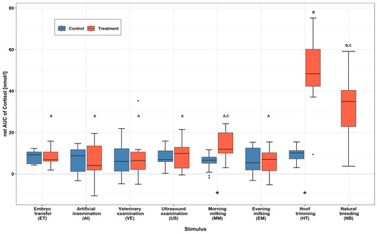 Comparison of overall serum cortisol concentrations. There was no significant difference in overall cortisol concentration measured in net AUC between the Co groups. Significant differences between the Tr groups were identified (ABC p < 0.05). * p ≤ 0.001 represents significant differences in overall SCC between the Co and Tr groups within each stimulus. No data from the Co animals were collected during the natural breeding experiment. • = values 1.5 times the interquartile range.