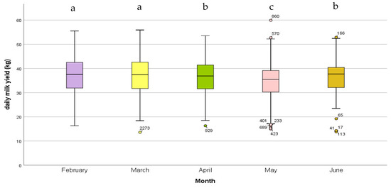 Boxplot representing daily milk yield per month: significant differences between months (abc p < 0.05). • = values 1.5 times the interquartile range.
