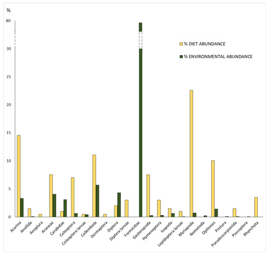 The invertebrates obtained from environmental sampling and from stomach contents were subjected to the same identification procedure, using a dissecting microscope and taxonomic keys. All invertebrates have generally been identified at the Order or Class level, both partially digested invertebrates obtained from stomach flushing and those captured in the traps. Given the objective of investigating functional and dimensional categories (P2 prediction), we have distinguished ecologically dissimilar life stages of the same taxon (e.g., winged adults and terrestrial larvae) and, using the same criterion, related taxa with marked ecological differences (e.g., flying Hymenoptera were distinguished from walking ones, e.g., ants) [11,37,38]. Adult carabids, for their markedly larger size, were distinguished from other Coleoptera adults, while larvae were grouped into a single category. Throughout the entire manuscript, we will use this categorization for identified invertebrates.