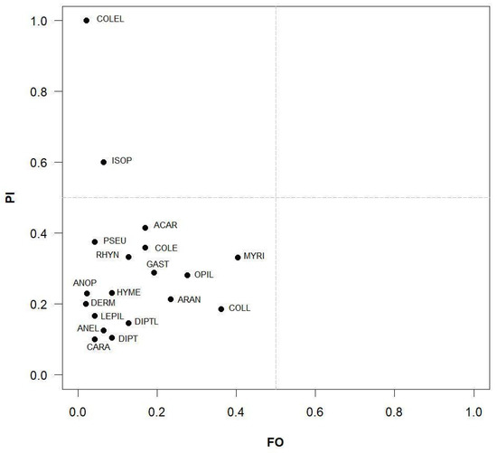 Costello’s modified plot [43,44] describing the trophic strategy of Salamandra atra aurorae. Legend: ACAR, Acarina; ANEL, Anellida; ANOP, Anoplura; ARAN, Araneae; CARA, Carabidae; COLE, Coleoptera; COLEL, Coleoptera larvae; COLL, Collembola; DERM, Dermaptera; DIPT, Diptera; DIPTL, Diptera larvae; GAST, Gastropoda; HYME, Hymenoptera (not Formicidae); ISOP, Isopoda; LEPIL, Lepidoptera larvae; MYRI, Myriapoda; OPIL, Opiliones; PSEU, Pseudoscorpionida; RHYN, Rhynchota.