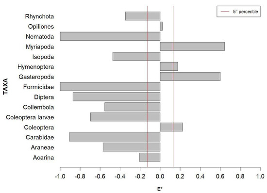 The analysis of the relativized electivity index E* showed that salamanders positively selected only Myriapoda, Hymenoptera, Gastropoda, and Coleoptera, while all other prey categories were apparently avoided (Figure 3). Opiliones was the only prey consumed in proportion to environmental availability, with an E* value within the significance threshold.