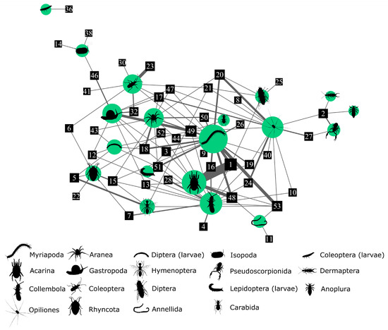 Myriapoda, Aranea, Diptera larvae, and Lepidoptera larvae were the prey items that occupied the central nodes of the network, whereas Coleoptera larvae, Isopoda, Dermaptera, and Anoplura were the most peripheral ones (Figure 4).