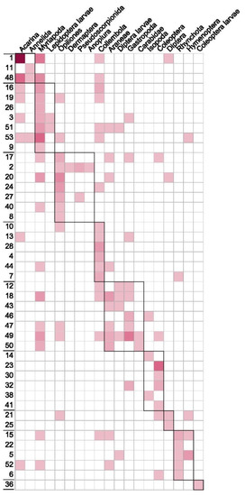 Weighted matrix of predator-prey interactions. Predators (salamanders) are represented as rows and prey taxa as columns, and the number of interactions is indicated by the color gradient (light pink: few interactions, dark red: many interactions). Cells have been subdivided into modules, enclosed by black rectangles, through the Beckett’s algorithm. Individual salamanders within the same module present more similar diets than between different modules.
