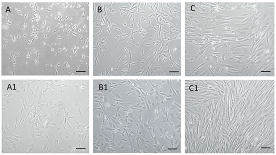 MSCs isolated from dogs’ amnion. MSCs isolated from dogs’ amnion in passage zero P0 ((A) DIV2, (A1) DIV5), first passage P1 ((B) DIV2, (B1) DIV4), and third passage P3 ((C) DIV4, (C1) DIV7). Scale bars: 50 µm.