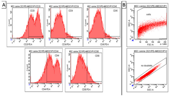 Amniotic MSCs. Results of CD analysis and gating strategy. (A) Canine A-MSCs from passage 1 show high positivity for CD 29 (81.5 ± 0.5%) and CD44 (77.4 ± 1.2%). However, low positivity for CD90 (14.5 ± 2.0%), CD34 (4.3± 1.0%), and CD45 (4.6 ± 0.9%). (B) Gating strategy—forward/sideward scatter and sidewards scatter/sideward scatter pulse height to elimination of debris and doublets. Number format explanation: 1.000 = 1000. M—Manual scaling setting. x—Multiplication.