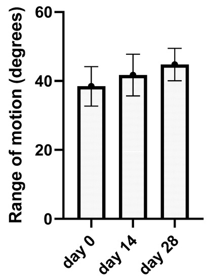 The bar graph represents kinematic gait analysis results. The average range of motion in degrees for a single day of application (day 0, day 14, and day 28) with standard deviation are summarized.