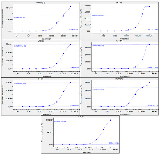 Figure represents standard curve for IFN-γ, IL-6, IL-15, IL-10, MCP-1, TNF-α, and GM-CSF, after serially diluted recombinant cytokine standards. Y-axis describes fluorescence intensity (FI) and X-axis describes concentration (pg/mL). Numbers in brackets are the Luminex beads numbers that were used. Number format explanation: 1,0 = 1.