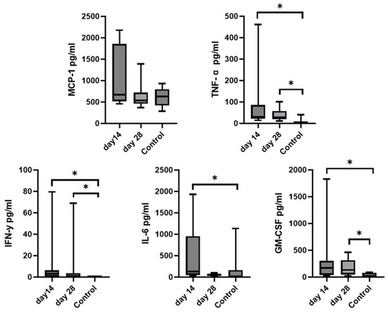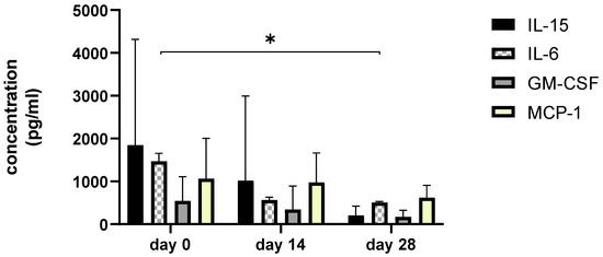 The bar graph shows concentration changes of level IL-15, IL-6, GM-CSF, and MCP-1 during day 0, day 14, and day 28. Asterisks represent statistical significance p < 0.05 for IL-6 concentration between day 0 and day 28.