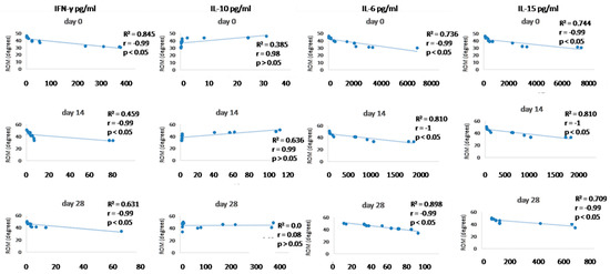 Since we finished the prescribed protocol of Milliplex map kit, Canine Cytokine Magnetic Bead Panel, 96-well plate assay (Merck KGaA, Darmstadt, Germany) as well as created the standard curve (Figure 6), we have observed measured concentrations (pg/mL) of IFN-γ, IL-6, IL-15, IL-10, MCP-1, TNF-α, and GM-CSF for the treated group and the control group (Table 4 and Table 5). In the control group, due to low concentrations, the IL-10 and IL- 15 were not detected (OOR<). For every biomarker we detected decrement at day 14 and day 28 in comparison to day 0, except IL-10 measured concentrations were higher at days 14 and 28 in comparison to day 0 (Figure 7). Statistical significance (p< 0.05) was observed in IFN-γ, IL-6, IL-10, and TNF-α between days 0 and day 28 (Figure 7 and Figure 8). Mann–Whitney U-test showed statistical significance (p < 0.05) in TNF-α, IFN-γ, and GM-CSF concentrations between day 14 and the control group as well as at day 28 and the control group. IL-6 concentrations showed statistical significance (p < 0.05) between day 14 and the control group. MCP-1 concentration showed no statistical significance with the control group (Figure 9). IL-10 showed a positive correlation with ROM at day 0, day 14, and a mild positive correlation at day 28. IFN-γ, IL-6, and IL-15 showed a negative correlation with ROM at day 0, day 14, and day 28. p < 0.05 was statistically significant in the correlation of ROM and IFN-γ, IL-6, and IL-15 at day 0, day 14, and day 28 (Figure 10). MCP-1, GM-CSF, and TNF- α showed negative correlation with ROM at day 0, day 14, and day 28. Correlations’ statistical significance (p < 0.05) in MCP-1, GM-CSF, and TNF-α and ROM at day 0, day 14, and day 28 was observed (Figure 11).