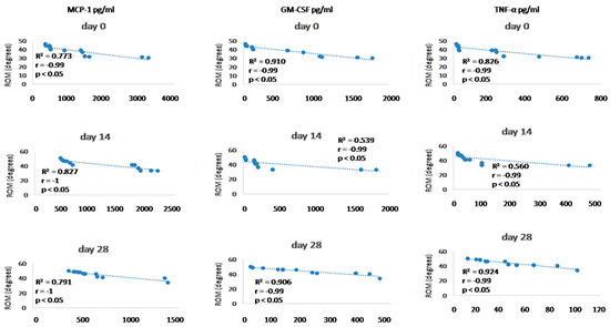 Statistical analysis of measurements from kinematic gait analysis and synovial fluid biomarkers concentration was performed by one-way ANOVA (Microsoft Office Excel, Microsoft Corporation, Redmond, WA, USA) with post-hoc Tukey’s test between each day of observation (day 0, day 14, and day 28). To analyse the correlation between ROM (day 0, day 14, and day 28) and each cytokine concentration during the treatment period (day 0, day 14, and day 28), Pearson’s correlation test and Spearman’s correlation test were used followed by the unpaired student T-test to detect statistical significance. To analyse the statistical significance between the control group and day 14 and day 28 of cytokine biomarkers, a Mann–Whitney U-test was performed. The results of the measurements were illustrated in Microsoft Excel Graphs and GraphPad Prism graphs (GraphPad Software Inc., La Jolla, CA, USA).