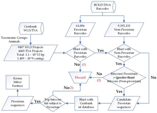 Overview of the bioinformatic pipeline used to scan protistan contamination. Three steps (1–3) reducing the amount of candidate sequences were marked red.
