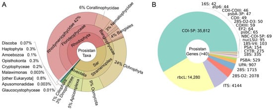 Distribution of DNA barcodes among taxa (percentage) (A) and genes (name: number) (B) of protists in BOLD database.