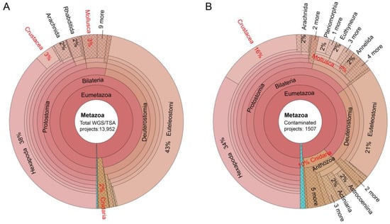 Krona plot illustrating numbers of total (A) and protist-contaminated (B) metazoan assemblies/projects at various metazoan taxonomic levels. Three animal taxa with significantly higher contamination rates were marked in red font.