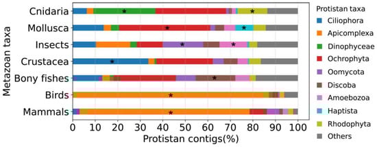 Distribution patterns of protist-contaminated contigs in assemblies of different animal taxa. The percentages of contigs belonging to each protistan taxon were calculated in the following way, taking Apicomplexa in mammals as an example: ‘Number of Apicomplexa-contaminated contigs in mammal assemblies’/‘Number of all protist-contaminated contigs in mammal assemblies’. Asterisks (*) denote the most representative animal taxa of each protistan taxon.