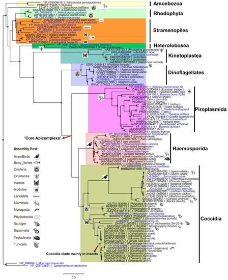 As the preceding subsection revealed, host-specific protist distribution is also observed in the phylogenetic tree resulting from the smaller dataset. For example, assemblies of mammals and birds have an abundance of apicomplexan contamination, with the order Piroplasmida most represented by mammals, and Haemosporida by birds. Haemosporida are globally distributed and can cause malaria-like diseases in birds [35]. In addition, the clade of dinoflagellates is mainly composed of protists derived from contigs of Cnidaria.