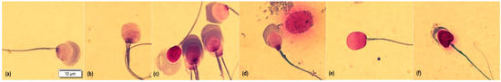 Atypical forms in guinea pig spermatozoa with Hemacolor® staining (Merck, Darmstadt, Germany). Normal (a), spermatozoa with macronucleus (b), micronucleus (c), pyriform (d), elongated (e), and lanceolate (f). Bar represents 10 μm.