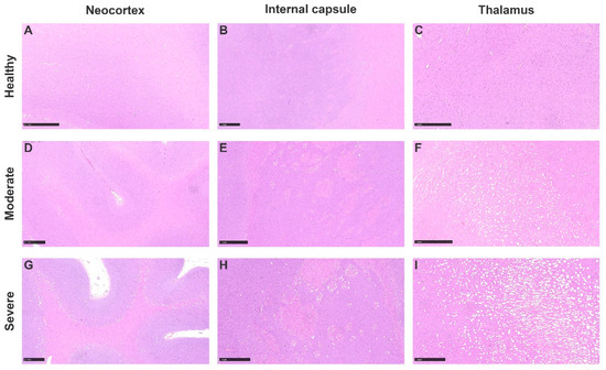 Brain vacuolation. Hematoxylin–eosin. Healthy animals with no vacuoles are shown in (A) neocortex, (B) internal capsule and (C) thalamus. Moderately affected cases are shown in (D) neocortex, (E) internal capsule and (F) thalamus. Note severe vacuolization cases in (G) neocortex and (H) internal capsule and severe affectation of (I) thalamus. All bar scales represent 1 mm.
