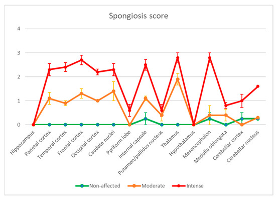 Brain distribution of the spongiform lesions. A semiquantitative score was given to the different brain areas studied from 0 (no lesion) to 3 (maximum intense vacuolation). The animals were grouped into three categories: healthy (negative controls, in green), moderately affected (orange) and severely affected (red). Bars: standard error of the mean.