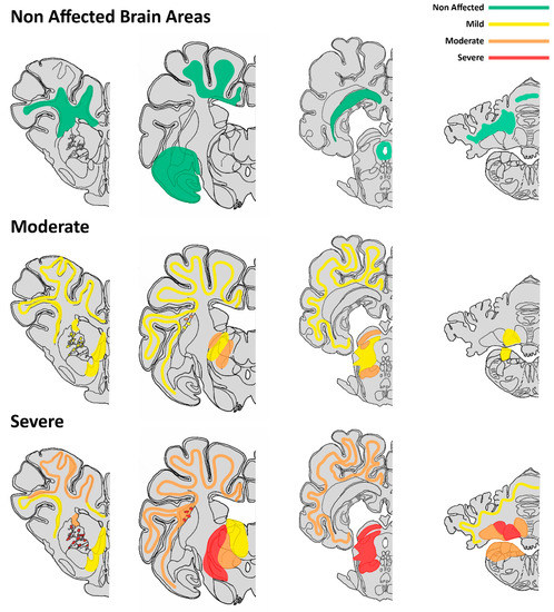 In all cases, from the non-affected to the most severe ones, several structures were not damaged, including the corona radiata, corpus callosum, paleocortex (piriform lobule), amygdala, hypothalamus, hippocampus, periaqueductal grey matter, white matter of the cerebellar medulla, dorsal nuclei of the medulla oblongata and spinal cord. A representative brain mapping of lesions in each of the two wasted groups is summarized schematically in Figure 3, based on a pig brain atlas from veterinary literature [19].