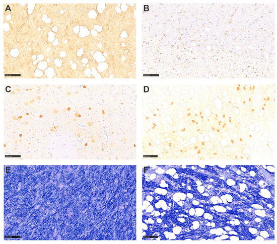 Special stains and immunohistochemistry. (A) GFAP antigen detection in an area with marked vacuolation of the parenchyma and absence of gliosis. (B) IBA1 antigen detection also in an area with marked vacuolation, with no evidence of gliosis or inflammatory infiltrates. (C,D) Parvalbumin antigen detection in control and spongiotic cases, respectively, with no evidence of GABAergic inhibitory neuronal population affectation. (E,F) Luxol fast blue stain of control and spongiotic cases, respectively, with no difference in tinctorial appetence amongst them. All bar scales represent 100 µm.