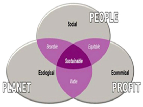 A sustainable farming system requires knowledge of all dimensions of sustainability that commonly include the economy, environment, and social wellbeing [2,4]. Figure 2 (adapted from [2]) shows a typical sustainability model, the so-called triple P model.