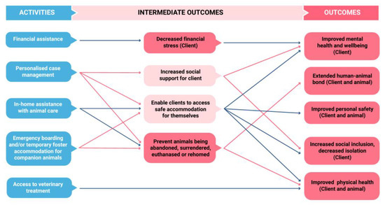 All 29 clients who completed the questionnaire reported positive outcomes experienced by their animals. The outcomes experienced by the client’s animals that were included in the model were (1) improved wellbeing as a result of preserving or improving the human–animal bond (experienced by 32 of 35 animals, 91%); (2) access to safe accommodation (experienced by 25 of 35 animals, 71%); (3) improved physical health (experienced by 25 of 35 animals, 71%; Table 2).