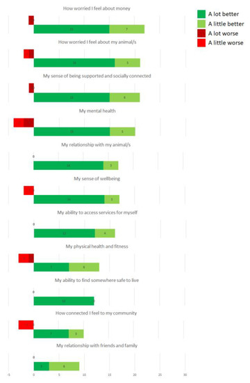 No clients reported negative outcomes as a result of the RSPCA NSW Emergency Boarding program through in-depth interviews. In the client questionnaire, six of 29 clients (21%) selected ‘a little worse’ or ‘a lot worse’ for one or more of the Likert-scale outcome questions (Figure 3). In addition, one client described a negative experience through the open-ended question ‘What are the most valuable changes that have happened for you as a result of your experience with the RSPCA?’.