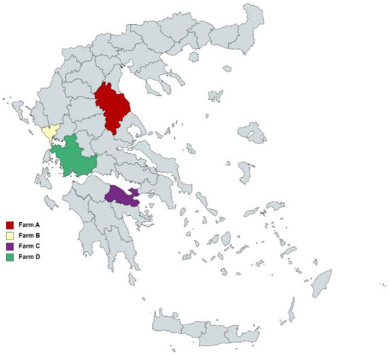 A total of ten intensive, zero-grazing dairy sheep farms were initially surveyed during on-site visits and interviews with the farmers, using a structured questionnaire to collect data regarding farms’ characteristics and management practices. Among them, four intensive dairy sheep farms with purebred Chios (farm A, B, and C) and Lacaune sheep (farm A and farm D)—located at different counties in Greece (Figure 1)—were selected and enrolled in the study, on the basis of (i) being representative of the intensive system [20], (ii) applying similar management schemes (Table 1), (iii) being recently found to be seropositive of MV, and (iv) fulfilling the terms of participation and collaboration during the whole duration of the study. From these farms, a total of 660 randomly selected ewes (6 months to 7 years old) were included in the study which initiated 2 to 4 weeks pre-mating. The selected animals were separately penned and prospectively studied for two consecutive years.