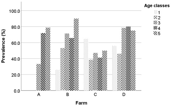 The age of the studied animals at the beginning of the study ranged from 6 months to 7 years, with a mean value equal to 2.4 ± 1.46 years. The mean ages of Chios and Lacaune ewes were 2.7 ± 1.55 and 1.8 ± 1.16 years, respectively. The prevalence of MV at the beginning of the study was 49.1%, 47.6%, 61.3%, 63.5%, and 82.5% in the age categories 1 (x ≤ 1), 2 (1 < x ≤ 2), 3 (2 < x ≤ 3), 4 (3 < x ≤ 4), and 5 (x > 4), respectively. The prevalence of MV at the beginning of the study per age class and farm is in Figure 2.