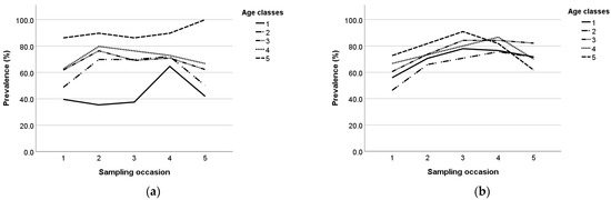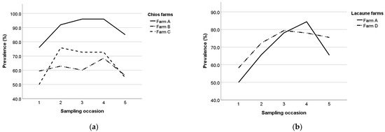 Seroprevalence during the study per age class and breed is presented in Figure 3a,b. During the study, the prevalence in age class 1 and 5 increased until the third sampling occasion and then decreased in Lacaune ewes, whereas in Chios ewes it fluctuated during the study. In age class 2, the prevalence followed a similar trend in both breeds; it increased until the fourth sampling and then decreased. Also, in age classes 3 and 4, the prevalence increased until the second sampling and then decreased in Chios ewes, whereas in Lacaune ewes, it increased until the fourth sampling and then decreased.
