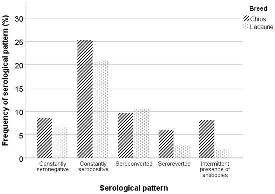 All serological patterns were observed in each farm except for the constantly seronegative Chios sheep in farm A. Similar percentages of constantly seronegative and seropositive animals were observed in both breeds. However, the Lacaune breed demonstrated a higher percentage of seroconverted animals, and the Chios breed demonstrated higher percentages of seroreverted animals and animals with an intermittent presence of antibodies (Figure 5). In Table 2, frequencies of serological patterns per breed and farm are summarized.