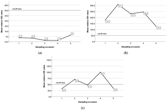Mean relative optical density (OD) values of ELISA in constantly seronegative ewes (a), constantly seropositive ewes (b), and animals with an intermittent presence of antibodies (c) during the study.