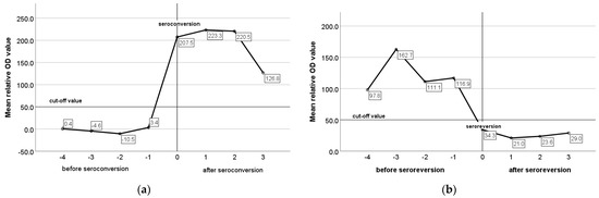Mean relative OD values of ELISA in seroconverted (a) and seroreverted (b) ewes before and after the seroconversion/seroreversion.