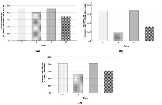 Maedi-visna period prevalence (a), incidence rate (b), and cumulative incidence (c) for each farm during the study.