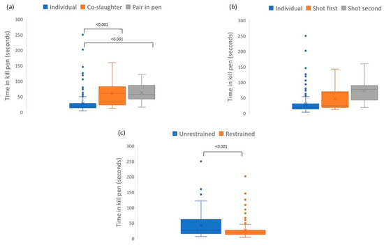 Relationship between time spent in kill pen prior to slaughter. (a) Whether the animal was in the pen individually, brought in with a conspecific and co-slaughtered, or brought in with a conspecific, which is then removed, leaving the animal alone for shooting. (b) Type of grouping in pen and shot order. (c) Restraint method, showing differences in time for all these factors (slaughter grouping, shot order, and level of restraint).