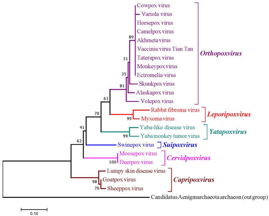 A phylogenetic tree of DNA-dependent RNA polymerases among Capripoxviruses (SPPV, GTPV, and LSDV) and the 19 most similar viruses was reconstructed to predict their evolutionary relationships (Figure 1). The Neighbor-Joining (NJ) method [40] was employed with the bootstrap test (100 replicates). The evolutionary distances were calculated using the Poisson correction technique [41]. The phylogenetic tree was drawn to scale (0.10) to show the number of differences between sequences. The scale of 0.10 means 10% differences between two sequences.