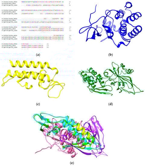 (a) Multiple sequence alignment of DNA-dependent RNA polymerase of selected Capripoxviruses (i.e., goatpox virus (V5KZN2), sheeppox virus (P19749), and lumpy skin disease virus (Q8JTZ9)), where asterisks (*) are indicating positions where a single, fully conserved residue is found, colon (:) is indicating conservation among residues with strongly similar properties, and the period (.) is indicating conservation among residues of weakly similar properties. Predicted 3D models of DNA-directed RNA polymerase of (b) goatpox virus, (c) sheeppox virus, (d) lumpy skin disease virus. (e) Superimposition of 3D structures of viral proteins.