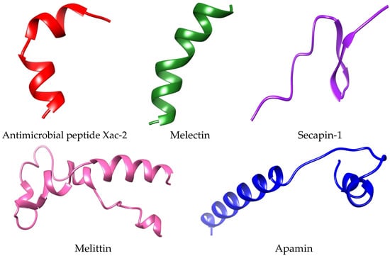 The 3D structures of five bee peptides including melittin (amino acid sequence: MKFLVNVALVFMVVYISYIYAAPEPEPAPEPEAEADAEADPEAGIGAVLKVLTTGLPALISWIKRKRQQR), apamin (amino acid sequence: MISMLRCIYLFLSVILITSYFVTPVMPCNCKAPETALCARRCQQHG), secapin-1 (amino acid sequence: YIINVPPRCPPGSKFVKNKCRVIVP), melectin (amino acid sequence: GFLSILKKVLPKVMAHMK), and antimicrobial peptide Xac-2 (amino acid sequence: GFVALLKKLPLILKHLP) were constructed using an online server trRosetta (Figure 3). The trRosetta is a deep network that predicts the inter-residue geometry to guide structure prediction based on direct energy minimization, as implemented in the ros framework [30].
