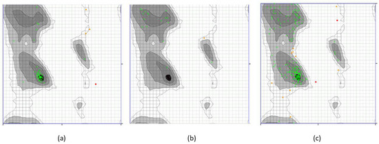 The Galaxy refine server was employed for the refinement of the best predicted models of each protein, which enhanced the Rama-favored regions from the initial 60% to 90% after adjusting the local infrastructure of the predicted models. Furthermore, the stability and accuracy of the predicted models were evaluated by Ramachandran plot analysis. About 85% of the amino acids of the predicted models fell in the Rama-favored regions, which signifies the accuracy of the predicted models. The top models with the best HADDOCK scores, with melittin representing 93.22%, secapin-1 showing 94.44%, and goatpox virus showing 93.55% of residues in the Ramachandran plot favored regions (Figure 4). The green color shows highly preferred observations, orange and black grids represent the preferred observations.