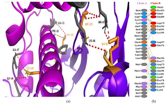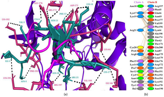 Protein–peptide interactions between honey bee protein (secapin-1) and goatpox viral DNA-dependent RNA polymerase. (a) Secapin-1 is represented in a magenta color with deep teal interacting residues, and GTPV is shown in purple-blue color with warm pink interacting residues. (b) Interacting residues between secapin-1 and GTPV.