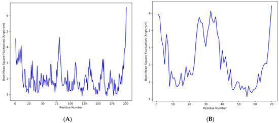Residue wise root mean square fluctuation (RMSF) showing the most fluctuated regions in the DNA-directed RNA polymerase as receptor protein and the ligand. (A) Receptor protein, (B) peptide as a ligand.