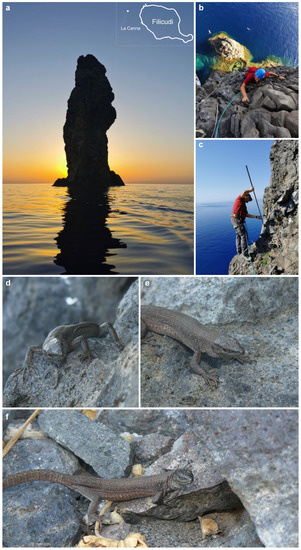 (a) The sea stack of La Canna and its position relative to the Filicudi Island (top right inset); (b,c) climbing and sampling activities on La Canna by the author; (d–f) Podarcis raffonei individuals from La Canna ((a–c) photos by L. Inzigneri; (d–f) photos by D. Salvi).