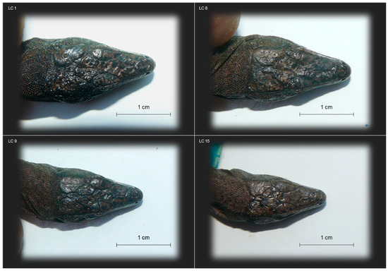Examples of malformations in cephalic scales (pileus) observed on lizards from La Canna. Malformations vary in types and extent, ranging from deformation of a few scales (e.g., LC 9) to a crumpled-bumpy amorphous structure extending over most of the pileus with loss of the scutellation pattern (e.g., LC 1).