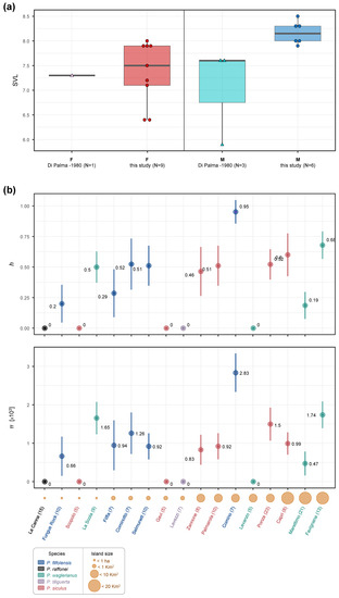 (a) Biometric data of the individuals of Podarcis raffonei collected in La Canna in this study, compared to measurements available for four individuals by Di Palma [8]. (b) Genetic diversity estimates based on the nd4 mitochondrial gene fragment in the La Canna population, compared with other 16 island populations belonging to the congeneric species P. waglerianus, P. filfolensis, P. tiliguerta, and P. siculus compiled from previous studies (see text for details). In the top plot is reported the haplotype diversity (h ± SD), and in the bottom plot is reported the nucleotide diversity (π ± SD; values are multiplied by 103 to reduce decimal places and increase readability). Along the X-axis, populations are ordered by increasing island size, which is illustrated by circles of different size (smallest circle: islet area 0.2–1 ha; small circle: islet area 2 ha–0.7 km2; medium circle: island area 1–7.5 km2; large circle: island area 10.3–19.9 km2), the number of individuals sequenced per island population (in brackets), and the island name coloured according to the Podarcis species present.