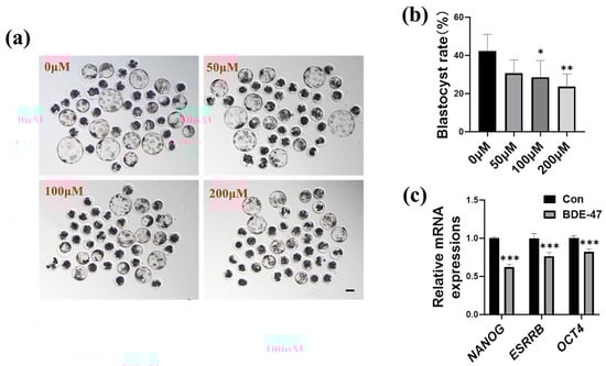Effects of varying BDE-47 concentrations (0, 50, 100, and 200 μM) on the in vitro formation of porcine blastocysts. (a) Typical images of embryos after being exposed to 0, 50, 100, and 200 μM BDE-47 for 7 days. Scale bar, 100 μm. (b) Rates of blastocyst formation in embryos co-incubated with various BDE-47 concentrations. The number of embryos (N) used in this experiment was 168, 167, 164, and 165 for the 0, 50, 100, and 200 μM BDE-47 groups, respectively (4 replicates). (c) Statistics on the embryos’ relative mRNA amounts of pluripotency-related genes, such as NANOG, ESRRB, and OCT4 in embryos were examined using RT-qPCR (3 replicates); The concentration of BDE-47 was 100 μM. The mean ± SD is presented for the data. *, p < 0.05; **, p < 0.01; ***, p < 0.001.