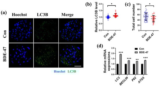 BDE-47 has been shown to impair embryonic development, and previous studies reported that BDE-47 could induce placental toxicity and developmental neurotoxicity by increasing autophagy levels in mice and rats [,,]. Therefore, we also studied the effect of BDE-47 on early porcine embryos’ autophagy. After 7 days of BDE-47 treatment, the expression of genes associated with autophagy and the amounts of autophagy marker LC3B in embryos were analyzed. The amount of the autophagy marker LC3B and the expression of genes associated with autophagy in embryos were assessed after 7 days of BDE-47 treatment. LC3B’s relative fluorescence intensity was dramatically increased to 1.14 ± 0.12 after being exposed to BDE-47 (Figure 2a,b). In addition, the total cell number in embryos decreased after BDE-47 treatment (Figure 2a,c). Additionally, treatment with BDE-47 increased the mRNA amounts of autophagy-related genes, such as LC3, BECLIN, p62, and ATG5 (1.93 ± 0.04, 1.34 ± 0.06, 1.27 ± 0.03, and 1.35 ± 0.13, respectively; Figure 2d). These results show that exposure of early embryos to BDE-47 increases autophagy levels and reduces total cell number in vitro.