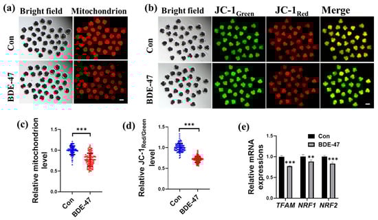 Oxidative stress can lead to mitochondrial dysfunction. Therefore, the effect of BDE-47 on mitochondrial function, mitochondrial abundance, mitochondrial membrane potential (MMP) amounts, and the mRNA amounts of related genes in porcine embryos were examined. After BDE-47 treatment, embryos at the four-cell stage had considerably lower levels of fluorescence intensity in mitochondria than that in the control group (0.77 ± 0.16; Figure 4a,c). Compared with the control group, the intensity of JC-1 red/green fluorescence decreased 0.72 ± 0.07-fold after the embryos were co-incubated with BDE-47 (Figure 4b,d), and BDE-47 significantly reduced the MMP. Furthermore, the mRNA amounts of the genes TFAM, NRF1, and NRF2 that are involved in mitochondrial biogenesis were also reduced in embryos incubated with BDE-47 (0.77 ± 0.02, 0.88 ± 0.04, and 0.83 ± 0.04, respectively; Figure 4e). These results suggest that BDE-47 treatment impairs mitochondrial homeostasis.